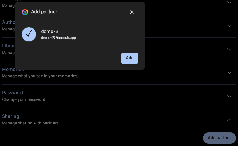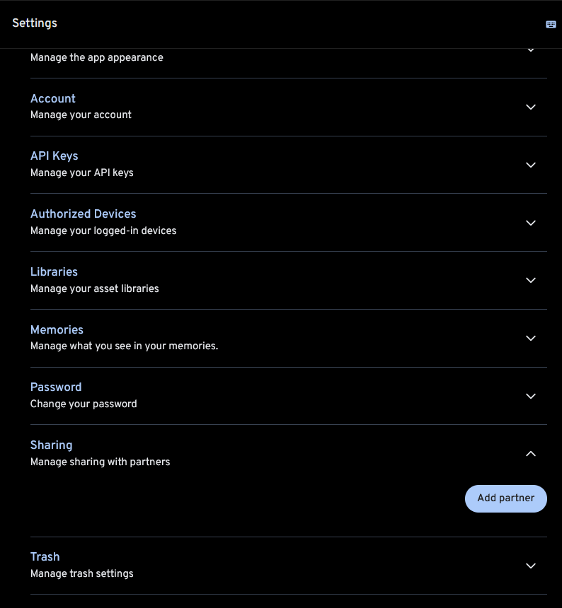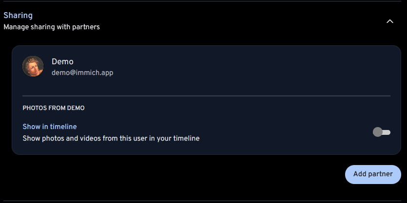 Immich allows you to share your library with other users. They can then view your library and download the assets. You can manage Partner Sharing from the User Settings page on the web.